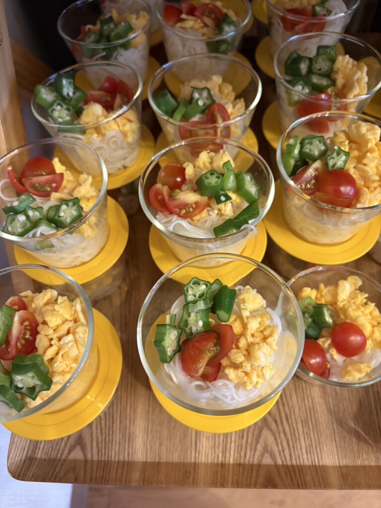 今回は直前に体調を崩し、こども食堂の開催が危ぶまれたのですが、ボランティアの仲間が手分けをして無事、こどもたちを迎えることができました。皆さん本当に優秀!素晴らしい仲間に巡り会えたこともまた子ども食堂をやっていく醍醐味でもあります。メニューは豚肉の生姜焼き、ナスとピーマンの鶏挽肉炒め、彩り野菜の炒めもの、煮卵、キュウリ、プチトマトをのせた素麺、デザートはぶどう、ピノ。75食出ました。