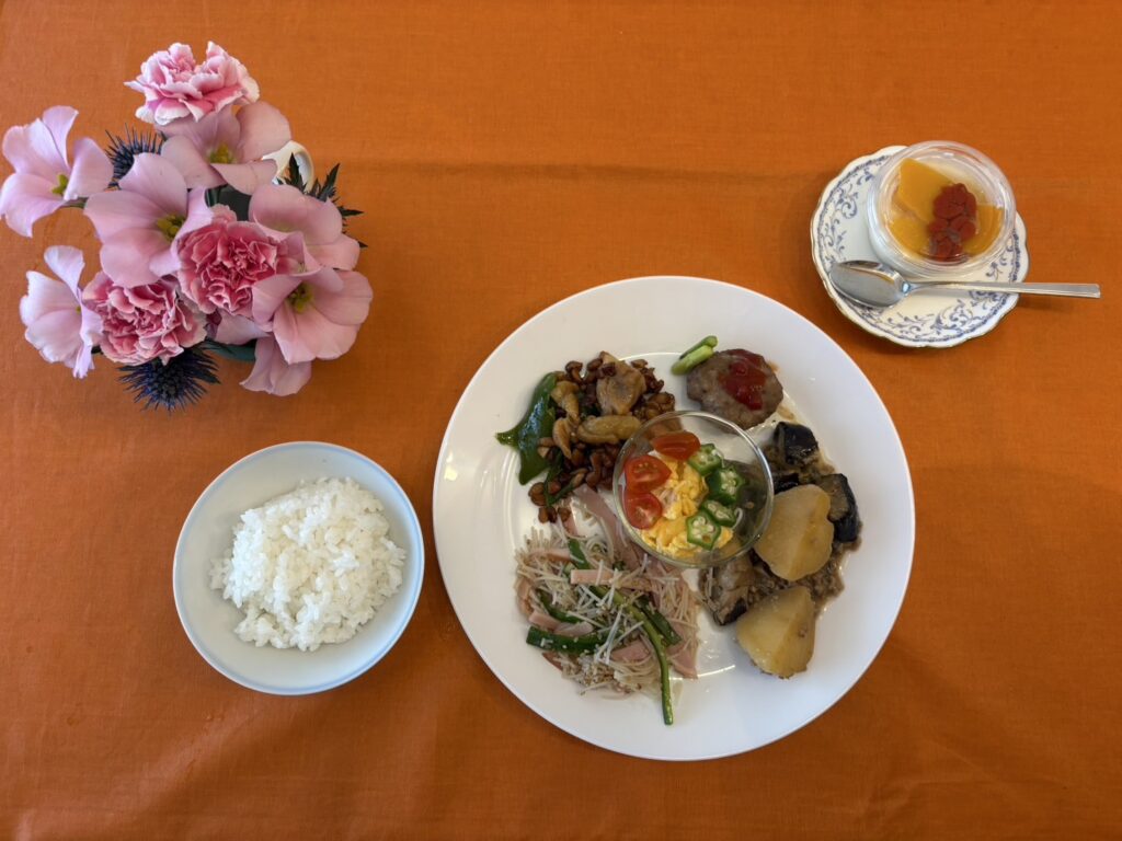 さっぱりしたものが食べたい夏の日。ミニトマトを湯剥きして、ハチミツに漬け、レモンゼリーをつくることにしました。これに桃、梨、ブルーベリーをふんだんに入れて旬のフルーツごろっとゼリーにしました。高級な黒毛和牛のすね肉をいただいたので、すきやきに。岐阜と軽井沢から新鮮なお野菜を送って頂いたので、大豆と鶏肉の炒め煮、夏野菜のグリル、ジャガイモのチーズ焼き、茹でトウモロコシ、きゅうりの浅漬け、ビーツの漬物、つるむらさきのおひたし、キャベツとかぼちゃのお味噌汁に。種類が沢山あって、食べるのが大変だったかもしれませんが、皆さん残さずに食べてくれました。60食出ました。