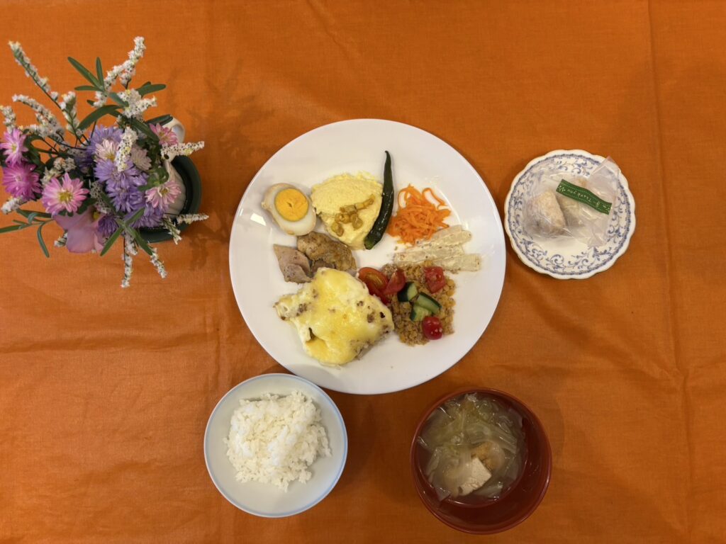 落花生の味噌和え、さつまいもサラダ、きゅうりと大根の浅漬け。プチデザートは黒豆のケーキ、和栗クリーム添え、ぶどうでした。黒豆は岐阜で採れたもの、栗は岐阜と愛媛産でした。63食出ました。