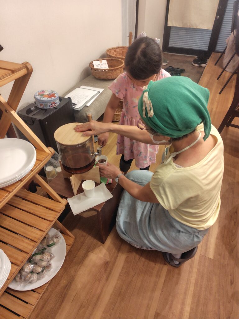 この日は夏休みの初日で、たくさんの子供たちが来てくれました。80食くらいと予想していましたが、86食出ました。途中でお弁当を追加で詰めました。メニューはとんかつ、焼きナスの味噌漬け、ズッキーニとオクラの海苔合え、トウモロコシと枝豆とアスパラのご飯、デザートは台湾風カステラでした。お米の配布もあり、前日からお手伝いに来てもらっていたのに、当日もてんやわんやでした。とんかつは低温調理で火を通してから揚げましたが、思ったより時間がかかり、揚げ係はぼーっとなってしまうほどの熱さでした。パン粉と小麦粉はそれぞれ1キロあれば足りるだろうと考えていましたが、途中で足りなくなり、急遽買ってきてもらいました。台湾カステラは蒸し焼きにすることで、ふんわりしっとり仕上がりました。こどもたちへのジュースの差し入れもいただき、お弁当の配布に加え、中でも透明の衝立を入れ、換気のために戸を開けて、一緒にご飯を食べました。