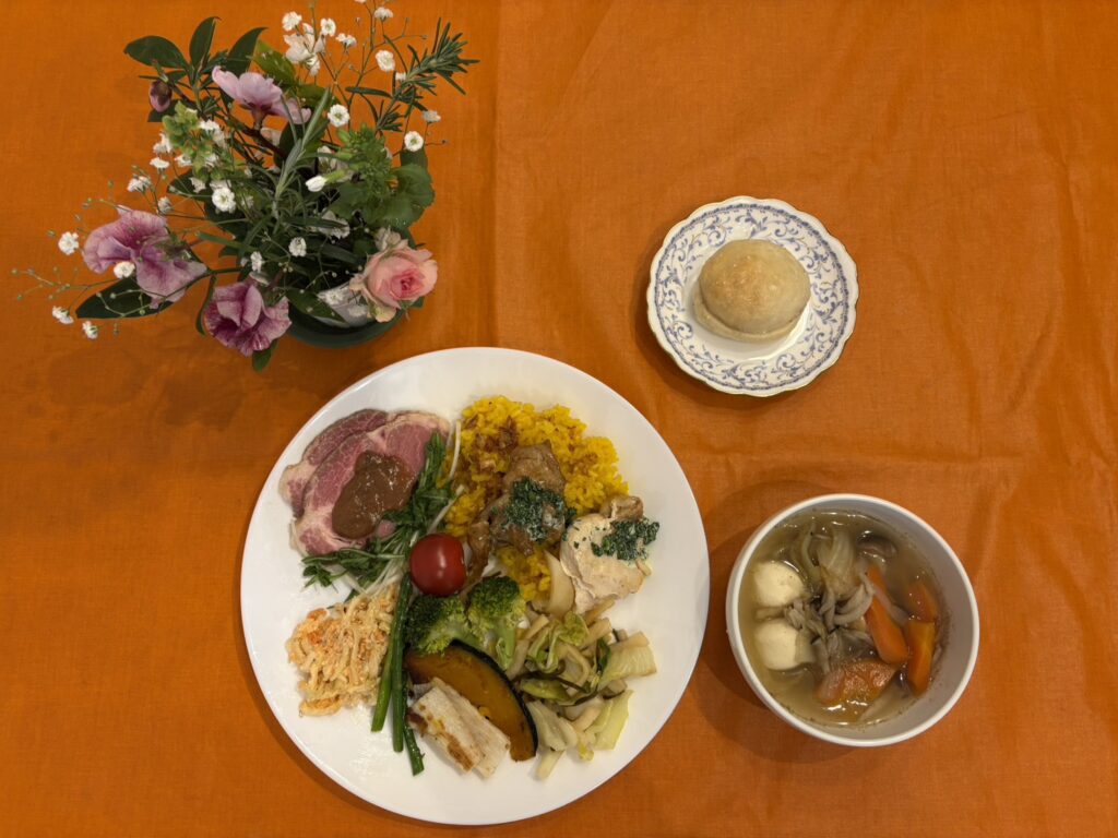 メニューは自家製燻製ハム、大根と水菜、きゅうりとわかめのサラダ、スクランブルエッグ 、オリーブとローズマリーの自家製フォカッチャ、具沢山のミネストローネ、デザートはプリンでした。
