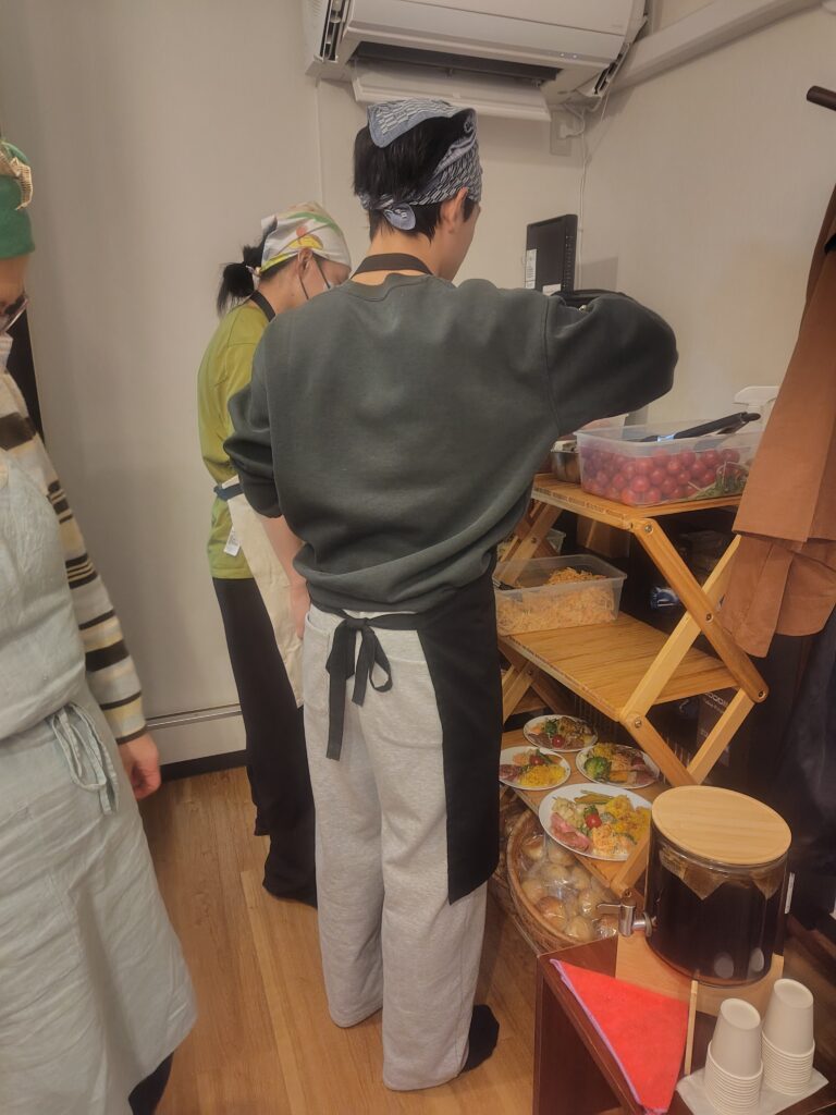 今回は初の試みで、お寿司を作ってみました。酢飯の中に自家製のガリと水菜を混ぜ込み、上に焼いたアジ、サワラ、炒り卵、自家製梅干しを載せました。岐阜からたくさんのサツマイモを頂いたので、コロッケのような芋まんじゅうに。贈答用の柿もいただき、パンナコッタの上に載せました。お代わりの声がたくさん聞けました。メニューは焼き魚の押し寿司、豚汁、サツマイモまんじゅう、もやし、春菊、ニラのナムル、キクイモの酢漬け、柿とパンナコッタ。82食出ました。